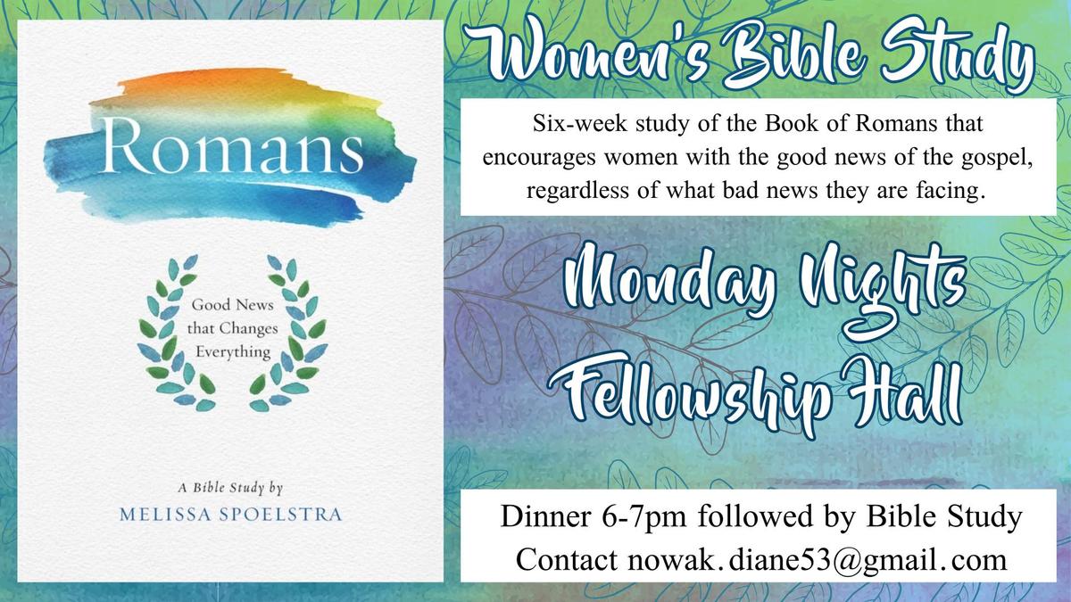 Women's Bible Study - Mondays, 6 PM Our Monday evening Bible study invites all women to join us at the Nowak Residence. An optional dinner will be provided for the suggested donation of $7.50. For more information, contact Diane Nowak.